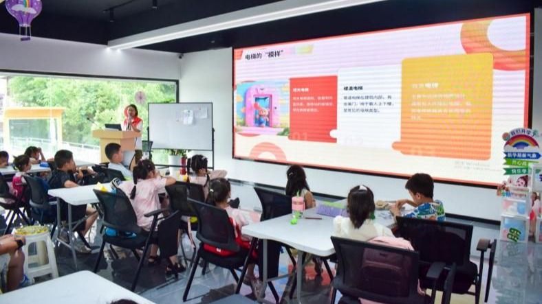下午,电梯组的吴晓、尹博睿、王璐佳、李佳虹四位志愿者化身“电梯小专家”,为小朋友带来“电梯安全必修课”。“电梯突然停了怎么办?”“按键时为什么要排队?”志愿者们用动画视频、实物模型演示,结合“被困电梯要按警报键”“不能扒门”等场景,将安全知识融入趣味问答。“我来回答!不能用手挡门!”5岁的小航第一个举手,志愿者递上小奖品:“答对啦!记住,安全最重要!”为了让知识更直观,志愿者还带小朋友观察了社区电梯的“安全标识”,并模拟“文明乘梯”场景:“先下后上,不蹦跳,不倚靠门……”孩子们学得有模有样,纷纷争当“电梯安全小卫士”。