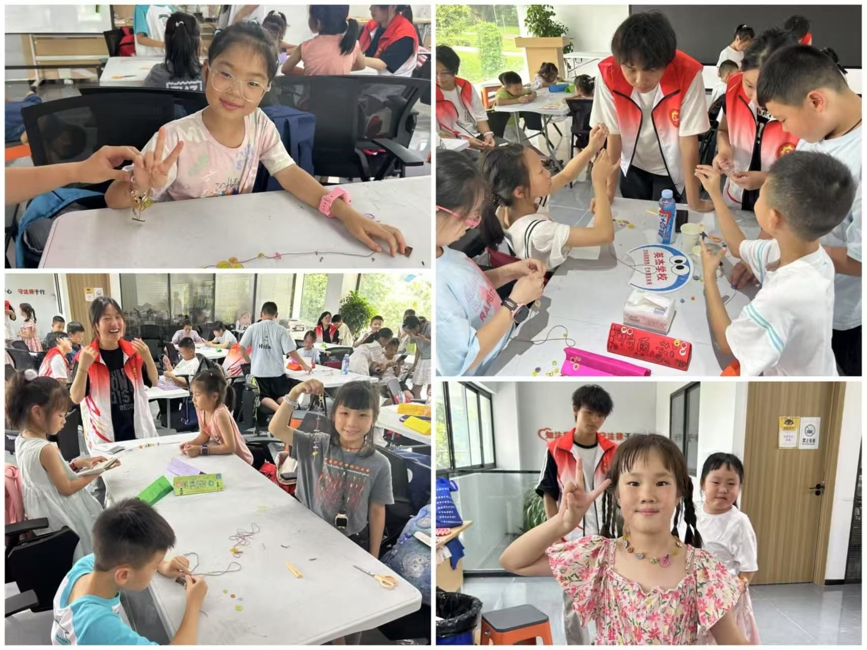 科普结束后 ,手工环节无缝衔接——孩子们用彩色纽扣、丝线和亮片制作“太空主题挂饰”。“我要做星星!”小宇捏着一颗金色纽扣,用丝线穿进打好的结里。“我想拼月亮!”朵朵把银色纽扣粘成月牙形状,还在背面贴了张小纸条——“送给妈妈的礼物”。志愿者们蹲在桌旁协助,帮孩子们固定歪歪扭扭的纽扣,整理散落的丝线。