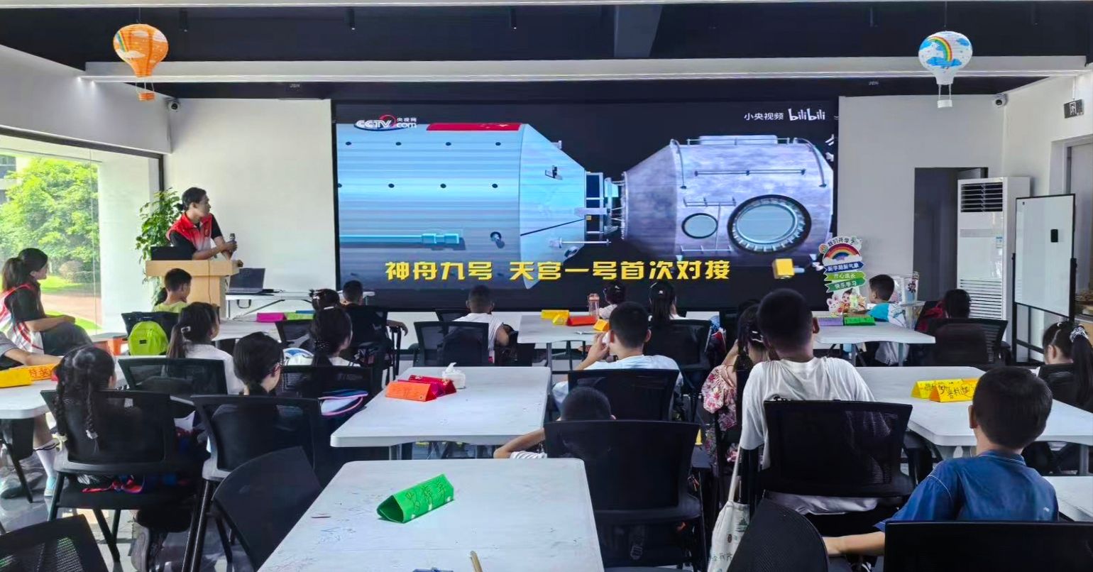 上午9点,社区活动室的课桌上还留着孩子们刚写完作业的铅笔印,志愿者们简单收拾后,便搬来音响——今天的“课后加餐”是一场“童梦音乐会”。“谁想第一个上台表演?”志愿者话音刚落,7岁的杨心睿西小朋友就举着小话筒冲上前,用奶声奶气的嗓音唱起《我的纸飞机》……下午2点,石岩松、韩知春、两位志愿者化身“航天小导师”,为孩子们带来太空知识科普。石岩松同学结合动画演示,把抽象的天文知识变得生动有趣。最受欢迎的当属“问答挑战”:“离地球最近的行星是?”“金星!”“中国第一艘载人飞船叫什么?”“神舟五号!”孩子们抢着举手,连平时不爱说话的小琪都大声喊出答案,志愿者为她戴上“太空小探索家”徽章。