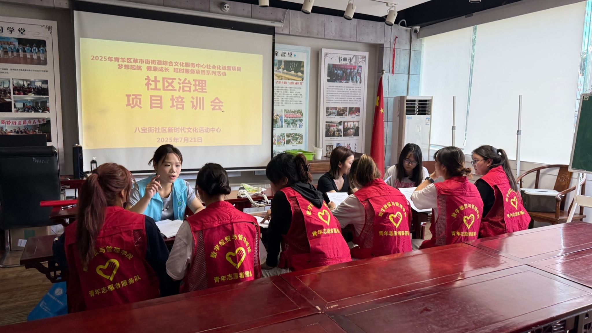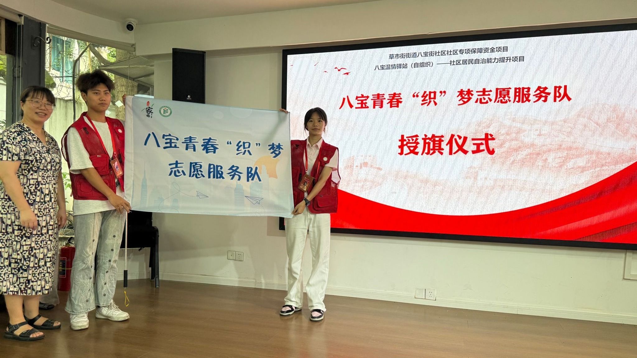 刁义向同学们介绍了八宝社区的概况,从传承、实践、成长三个方面,向同学们详细阐述了此次社会实践的意义和要求,希望志愿者们通过实践收获思想政治的高度,同时提升社会交往和实践的能力。刁义向志愿团队授予“八宝青春‘织’梦志愿服务队”旗帜。随后,双方围绕此次社会实践的具体细节进行了详细的讨论,社区工作人员和成都爬山虎社会工作服务中心对志愿者们进行了相关培训。