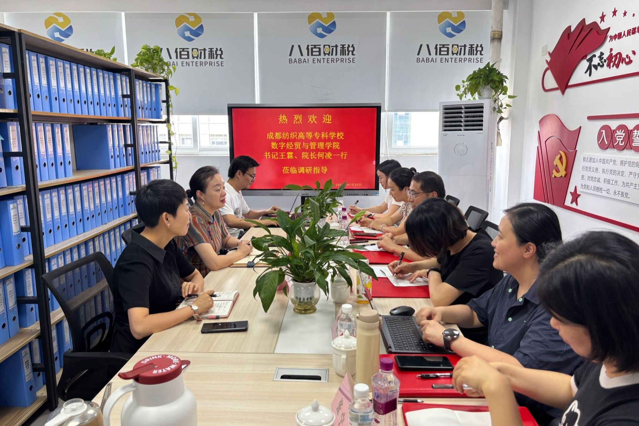 7月22日,数字经贸与管理学院党总支书记王霖、副院长(主持工作)何凌,大数据与会计专业教师曾川、张宁、蒲丽苹、屈璟走访四川八佰企业管理有限公司,与公司总经理任静、技术总监孙莉华、行政主管汤成伟,就校企合作、人才需求等方面进行调研交流,共促财税人才培养与实践创新的深度融合。