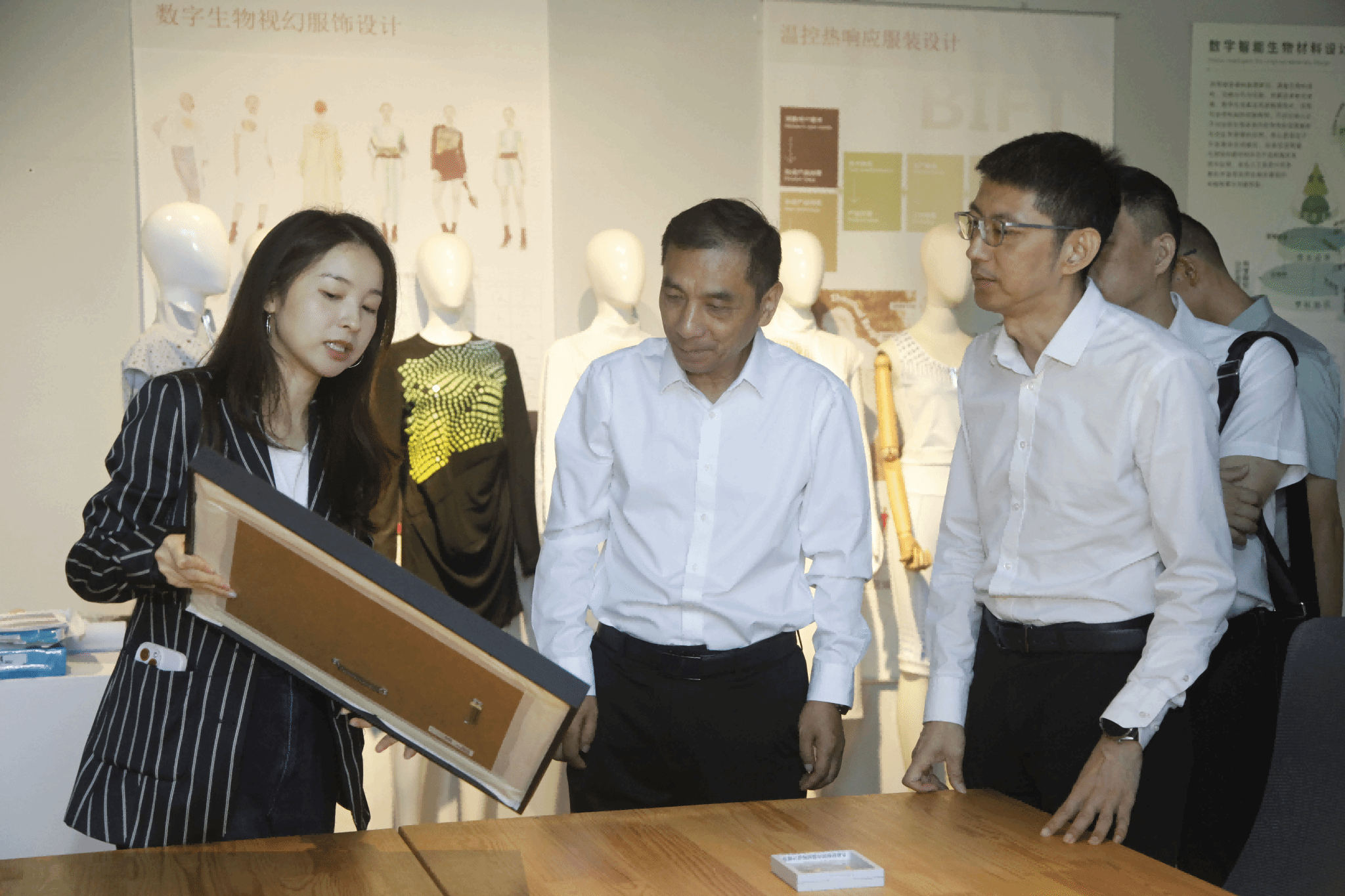 18日,调研团队奔赴北服,与校长贾荣林、副校长邹毅及相关部门负责人座谈。双方围绕本科教育与职业教育的共同点及差异性,就专业建设模式、人才培养体系优化、产教融合机制完善等议题展开深入交流。特别是在同一行业背景下,就如何规划未来服务产业发展的实施路径、对接龙头企业深化校企合作共同育人、充分利用科研平台提升科研服务能力与成果转化效率、国际化办学中优质教学资源引进与研究标准输出等方面议题,分享经验、交换意见,达成诸多共识。孙锐一行还参观了北服的服装博物馆、交叉前沿研究院及“为人民而设计”展,直观感受了该校在学科建设、科研创新与文化传承方面的特色与优势。