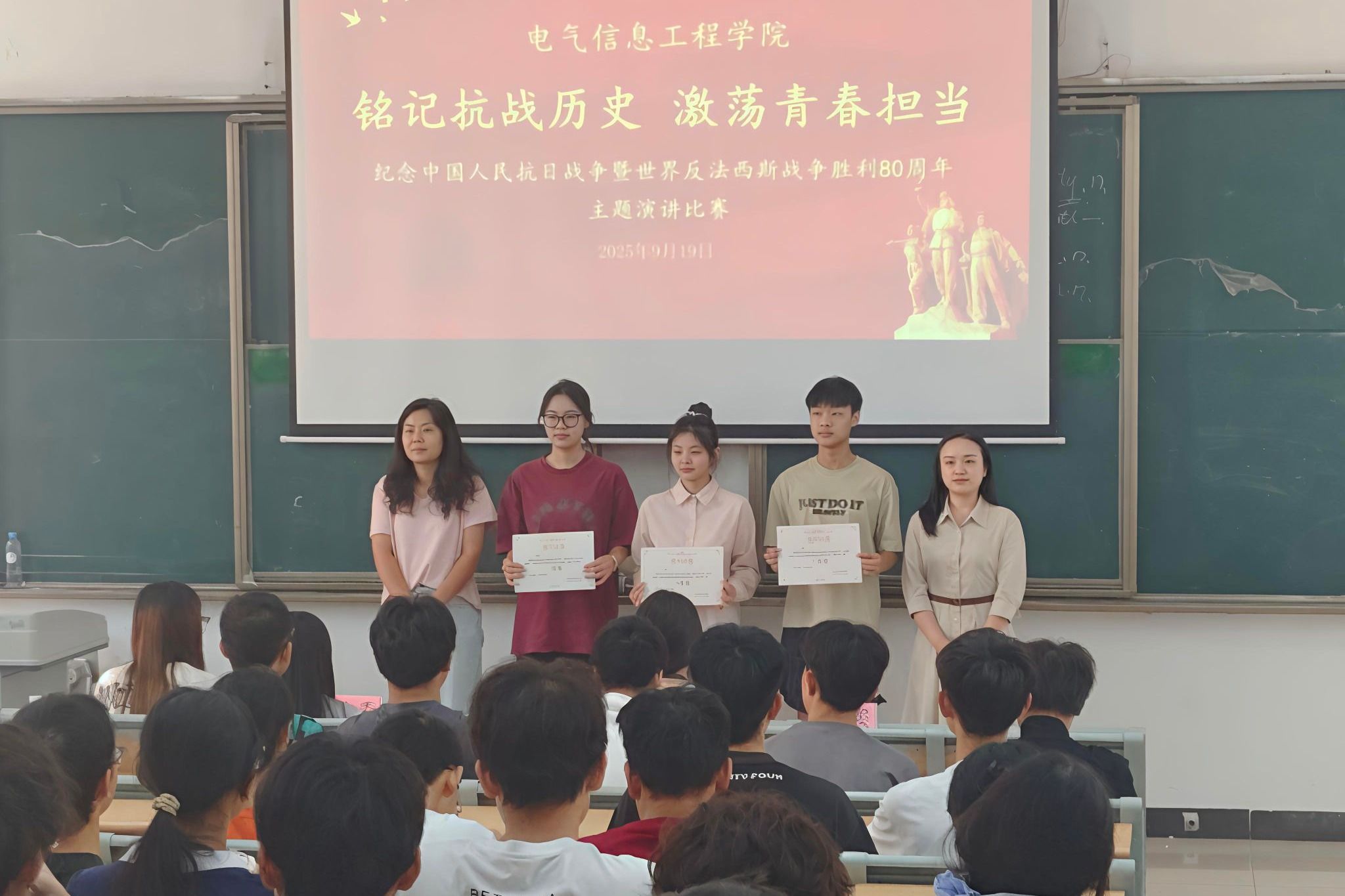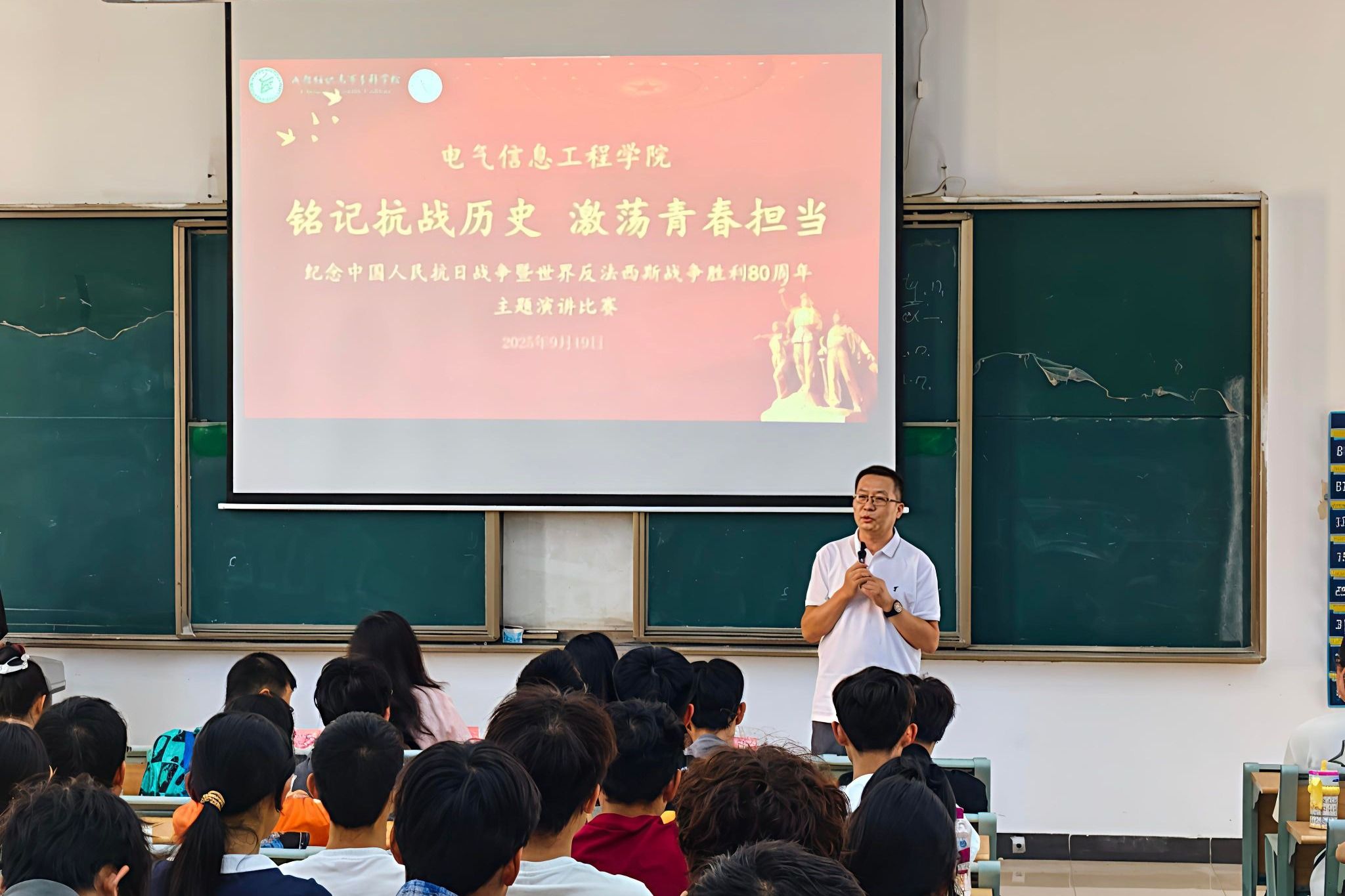 为深切缅怀革命先烈,弘扬伟大抗战精神,激发青年学子的爱国热情与时代担当,9月19日,电信学院在致知楼隆重举办“铭记抗战历史,激荡青春担当”——纪念中国人民抗日战争暨世界反法西斯战争胜利80周年主题演讲比赛。学院党总支书记姚玲峰、党总支副书记兼团总支书记张亚茹、专职辅导员樊璠及120余名学生代表共同参加活动。