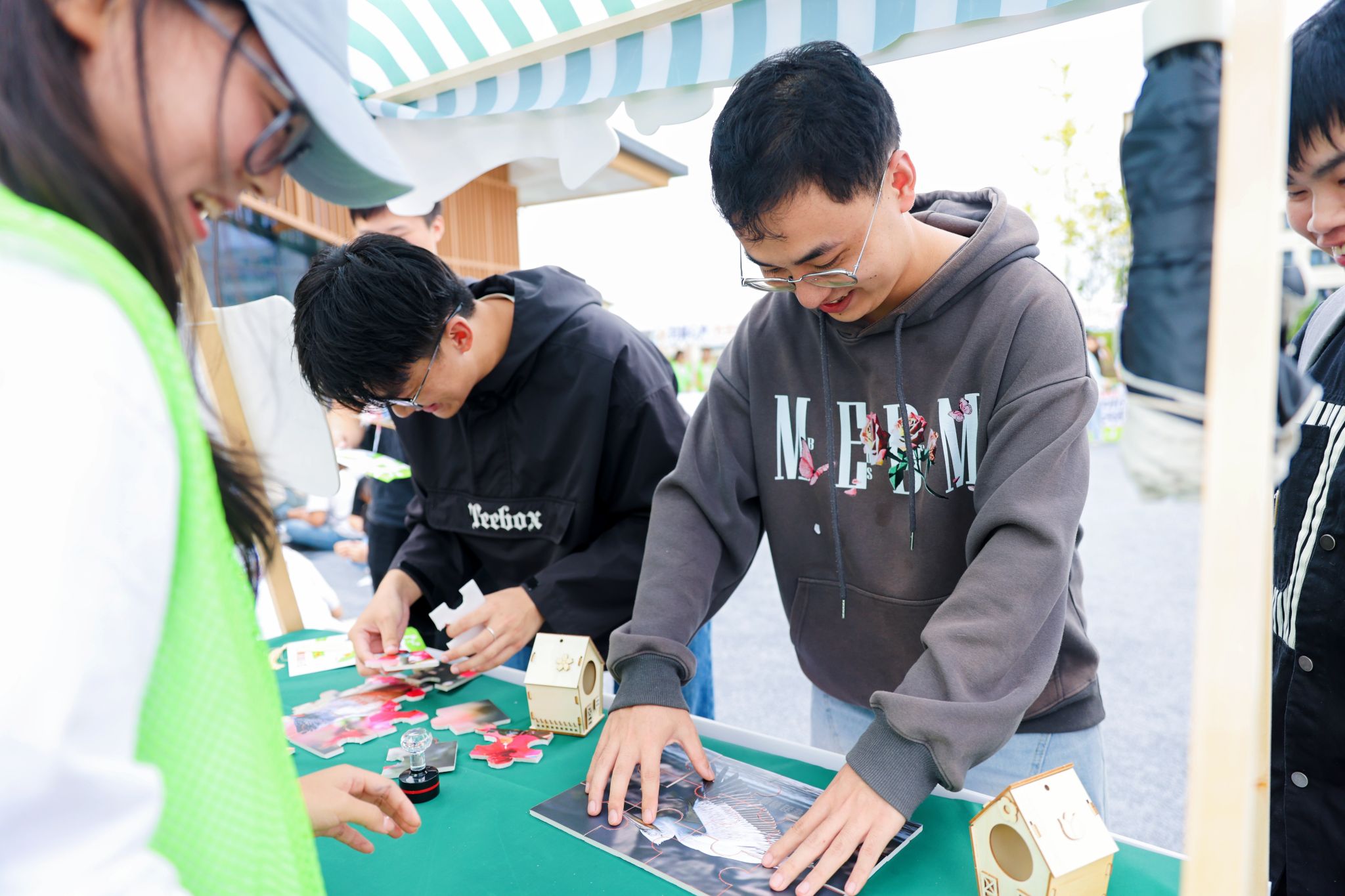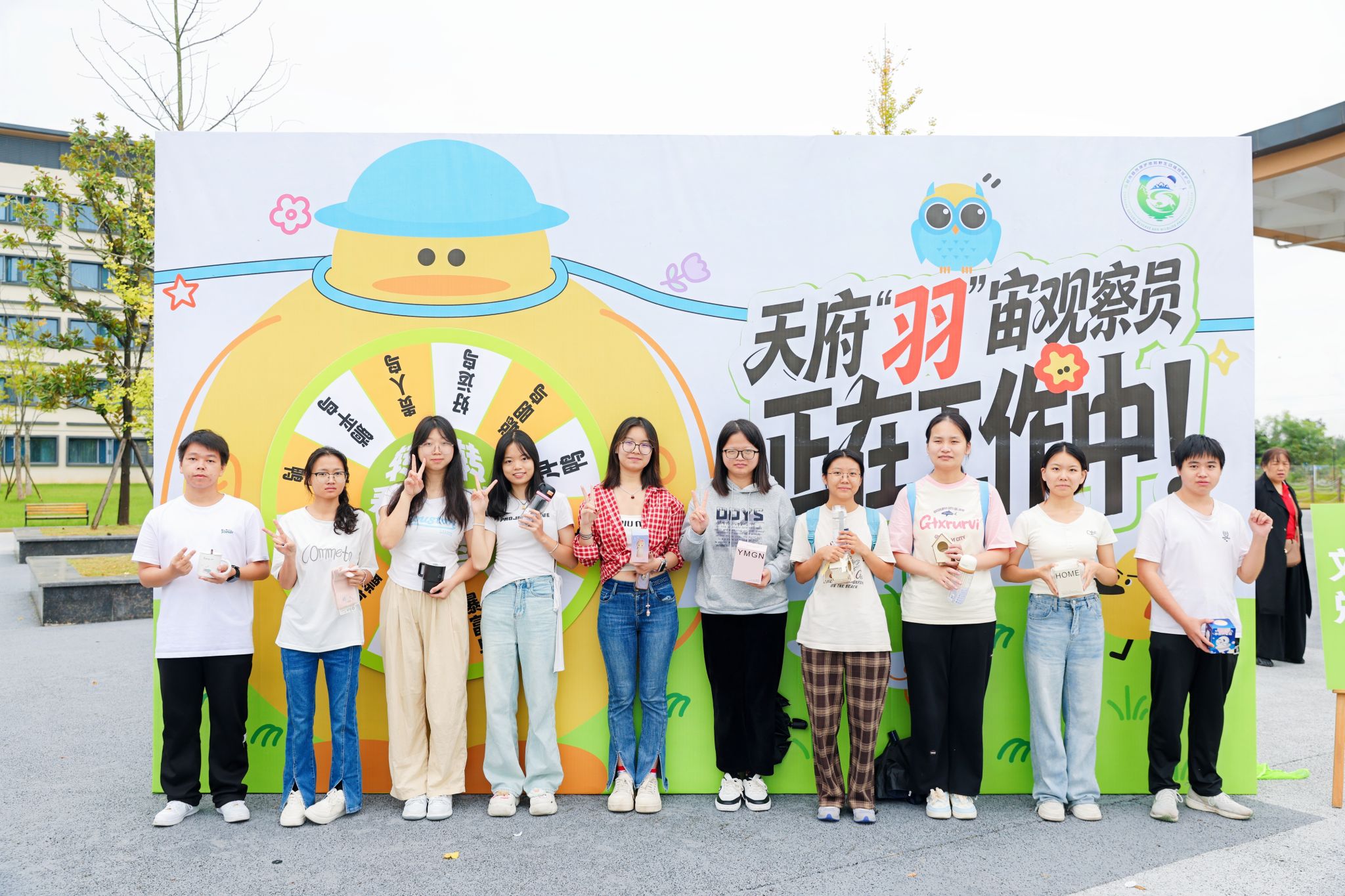 尽管秋雨淅沥,活动现场依然人气不减。学生们手持《天府“羽”宙漫游指南》集章卡,穿梭于五个创意互动站点之间。在“听声辨鸟”区,耳机中传来杜鹃、云雀、噪鹃等鸟类的鸣叫,参与者凝神细辨,仿佛瞬间穿越林间;“书签DIY”摊位前,画笔勾勒出飞鸟的轮廓,将自然之美凝于方寸;而在“筑巢引凤”区,学生们亲手用环保材料搭建象征性鸟巢,指尖翻飞间传递着对生命的敬畏。雨点轻敲帐篷,与现场的欢笑声、讨论声交织成一首独特的生态协奏曲。
