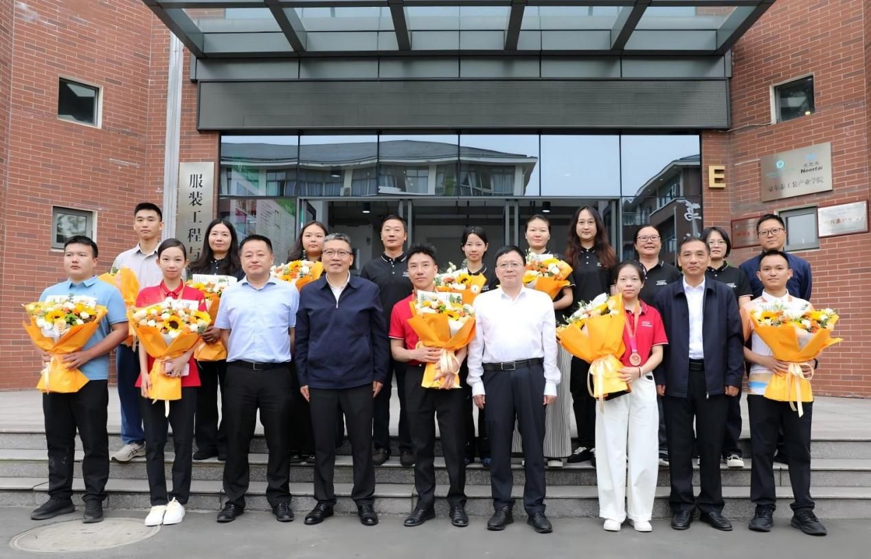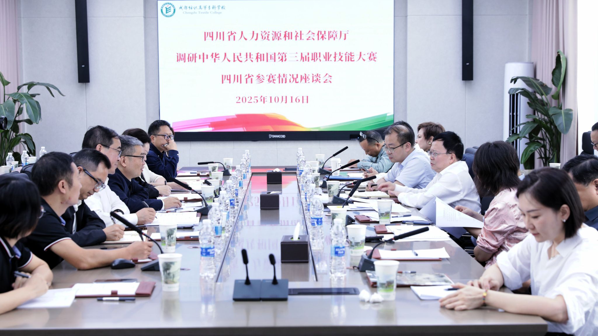 调研组一行慰问了第三届中华人民共和国职业技能大赛获奖师生,实地考察了pg电子服装制版和时装技术集训中心,并与学校党委书记任迎伟,党委常委、副校长刘莉、李明富、吴越,教务处、人事处和服装、创艺、数管学院负责人,以及参赛师生进行了座谈。
