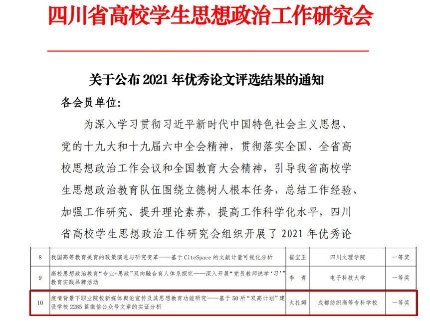 近日,2021年四川省高校学生思想政治工作优秀论文评选结果公布,pg电子太扎姆老师的论文《疫情背景下职业院校新媒体舆论宣传及其思想教育功能研究——基于50所“双高计划”建设学校2285篇微信公众号文章的实证分析》被评选为一等奖。