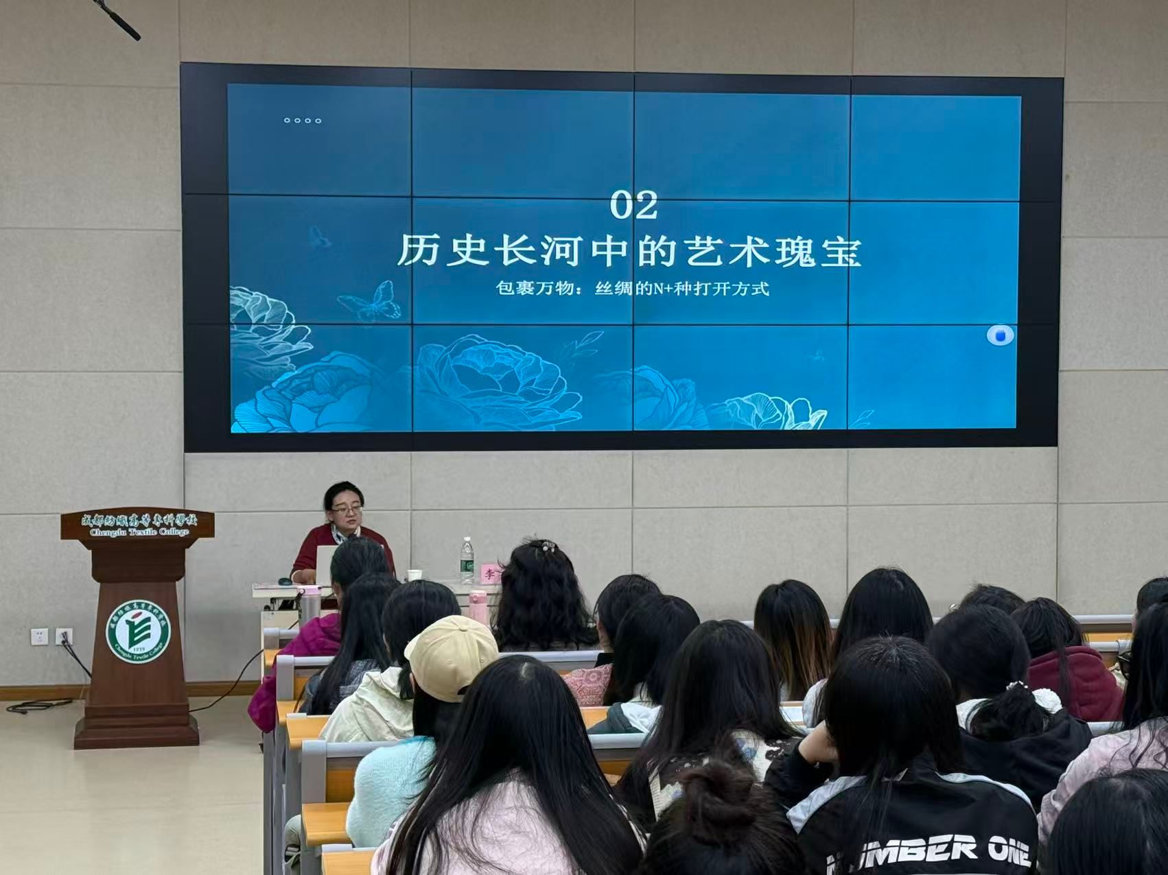李媛主任以博物馆的文化传承使命为切入点,系统梳理了蜀锦蜀绣的千年发展脉络。她结合四川博物院珍贵馆藏,详细阐述了蜀锦蜀绣的保管、保护与利用现状,并就该项非物质文化遗产在当代的传承与创新路径进行了深入分析。讲座内容兼具历史底蕴与时代视角,李媛主任凭借扎实的专业素养与丰富的实践经验,通过深入浅出的讲解与丰富的图像资料,增进了在场师生对蜀锦蜀绣工艺智慧、艺术价值与文化精神的深刻理解。现场座无虚席,与会师生纷纷表示,通过此次讲座,不仅增进了对非遗文化的认知,更增强了文化自信与民族自豪感。