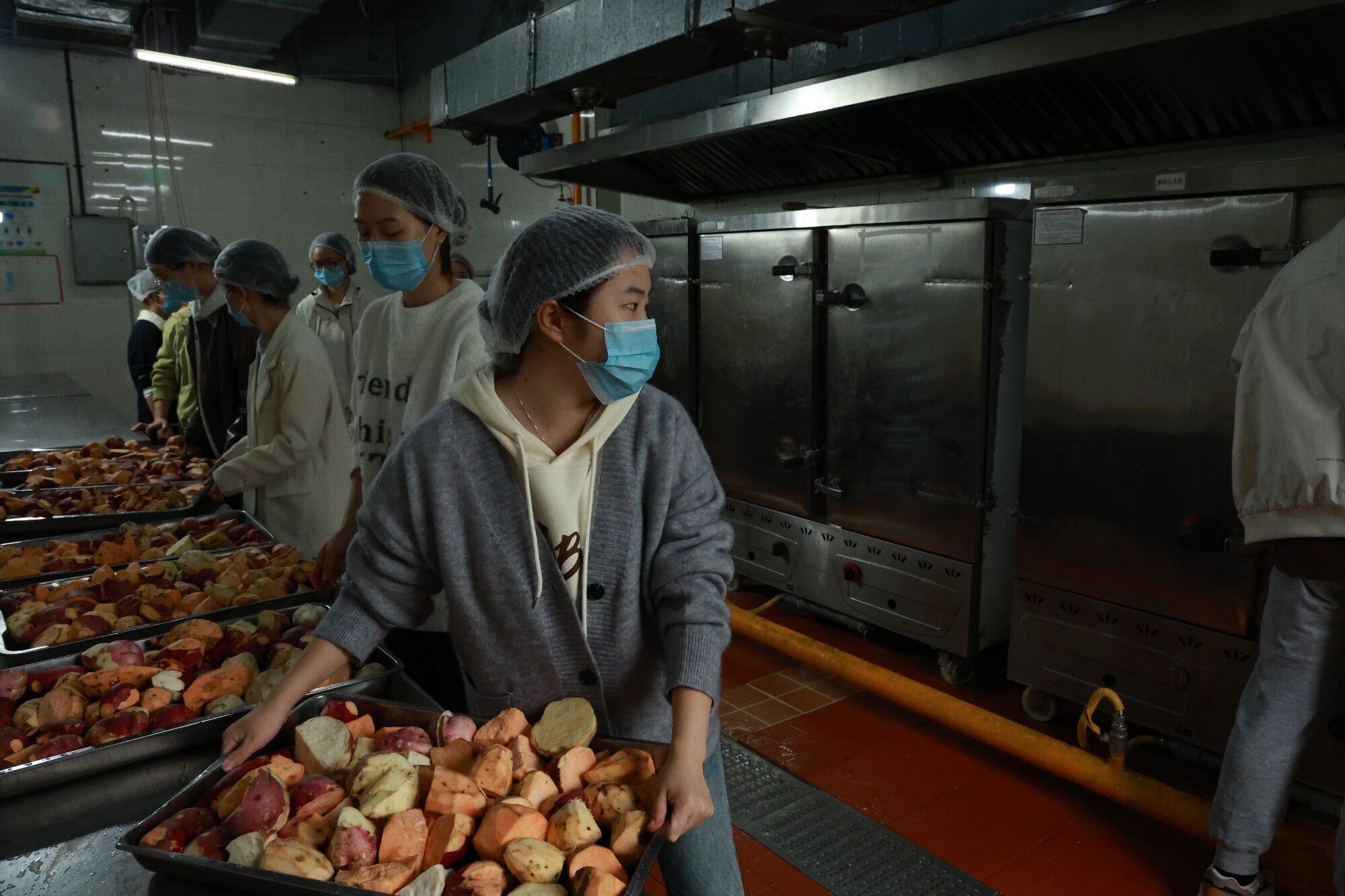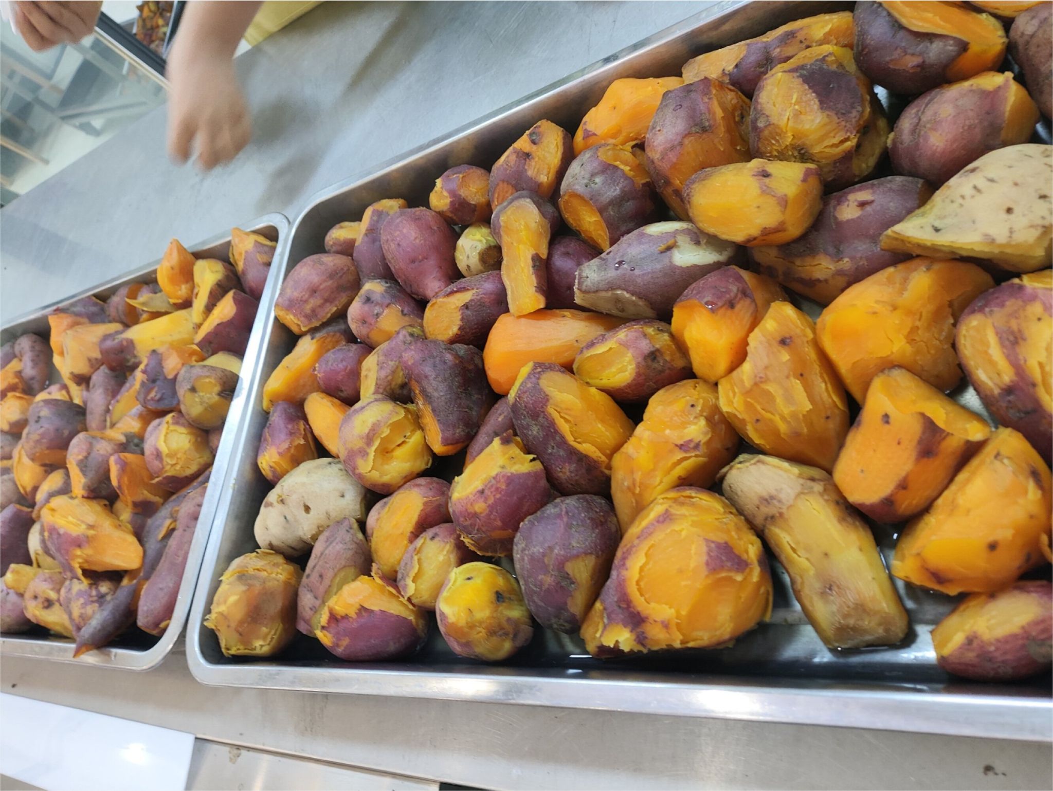 4日上午的集中筹备,师生们更是充满干劲。大家围坐在一起,进行红薯二次挑选,手持削皮刀认真去除表皮杂质,接着再次清洗确保洁净,最后将处理好的红薯送入蒸箱。