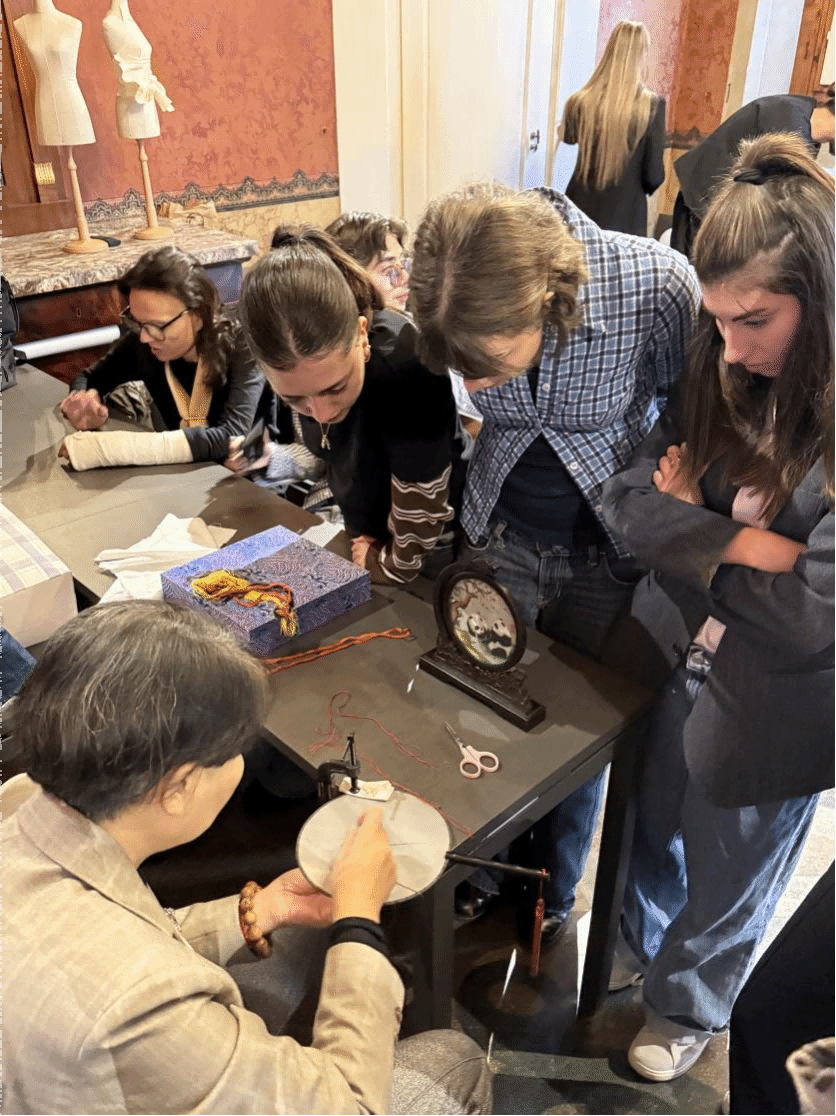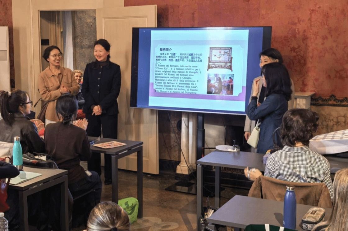 随后,代表团在佛罗伦萨自由美术学院服装学院新校区举办蜀绣技艺工作坊培训活动。朱利容教授系统讲解蜀绣的历史渊源、文化内涵与艺术特色,并现场指导意方师生体验蜀绣技艺。活动反响热烈,意方师生对精美绝伦的蜀绣作品与精湛技艺表达了高度赞赏与浓厚兴趣。
