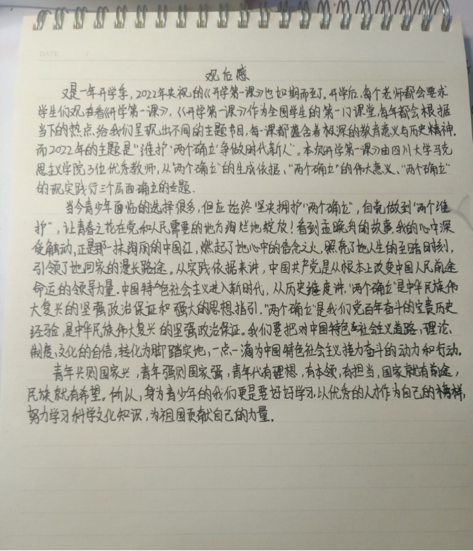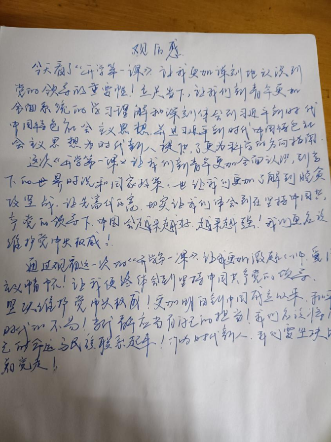轻工与材料学院高材202班杨红:2月27日观看了“开学第一课”,感触颇深。作为新时代的青年大学生,我们是祖国的希望和未来,必须要学会肩负起历史使命和社会责任,将来也必须为生我养我护我成就我的祖国做贡献。至于当下,认真学习实践习近平新时代中国特色社会主义思想,努力做一个有理想、有担当的人,就是爱国的正确打开方式。树立远大的理想,朝着目标不断前进,把对祖国对人民的深沉热爱,把对党的感恩之心,倾注于学习实践当中,尽快成长为建设者和合格接班人,就是我们正确的爱国行动。环境202班何慧:“两个确立”是历史和时代的选择,是党和国家的历史幸运、时代幸运,是实现第二个百年奋斗目标的根本保障。坚定拥护和维护习近平总书记的核心地位,全党就有定盘星,全国人民就有主心骨,中华“复兴”号巨轮就有掌舵者,面对惊涛骇浪,我们就能够做到“任凭风浪起、稳坐钓鱼船”。作为新时代的青年,我们要深入学习、深刻理解习近平新时代中国特色社会主义思想的时代背景、深邃内涵。同时,我们还要努力学习科学文化、知识技能,在踏入社会之后,可以更好回报祖国、社会和家庭,做一个真正爱国、爱家、能够承担责任的人。