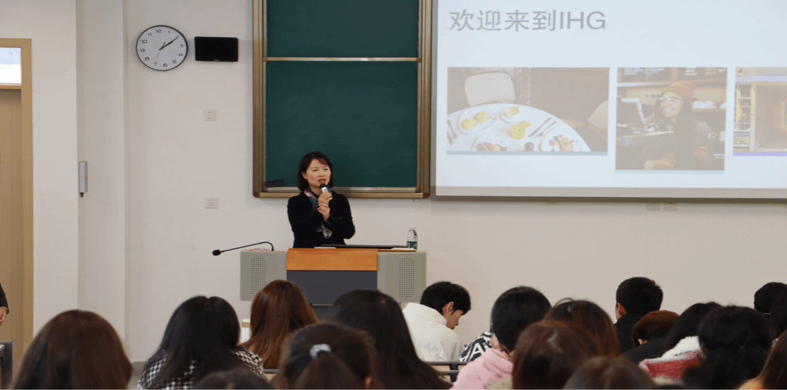 王敏主持宣讲活动。她介绍了洲际酒店集团概况,强调此次宣讲是学院深化产教融合、推进实习就业一体化培养的重要举措,希望通过校企协同为学子搭建国际化职业发展平台。