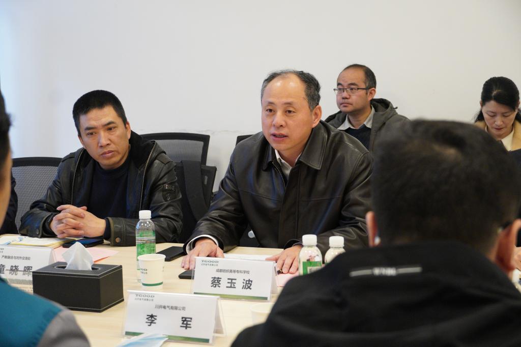 蔡玉波书记对公司的热情接待表示感谢,对企业取得的瞩目成绩表示赞许。他以“老、特、高、新”为概括,向李军董事长介绍了学校基本情况。他表示,成都纺专办学悠久、历史厚重、轻纺特色鲜明,是国家、四川省“双高”校,当前学校正朝着举办职教本科的崭新目标奋力前行。他指出,产教融合、校企合作是新时代职业教育高质量发展的必由之路,双方合作有愿望、有基础、有前景,对深入推进产教融合、校企合作充满期待,希望双方以点带面,逐步构建命运共同体,共同推动区域经济发展,彰显学校和企业社会责任。