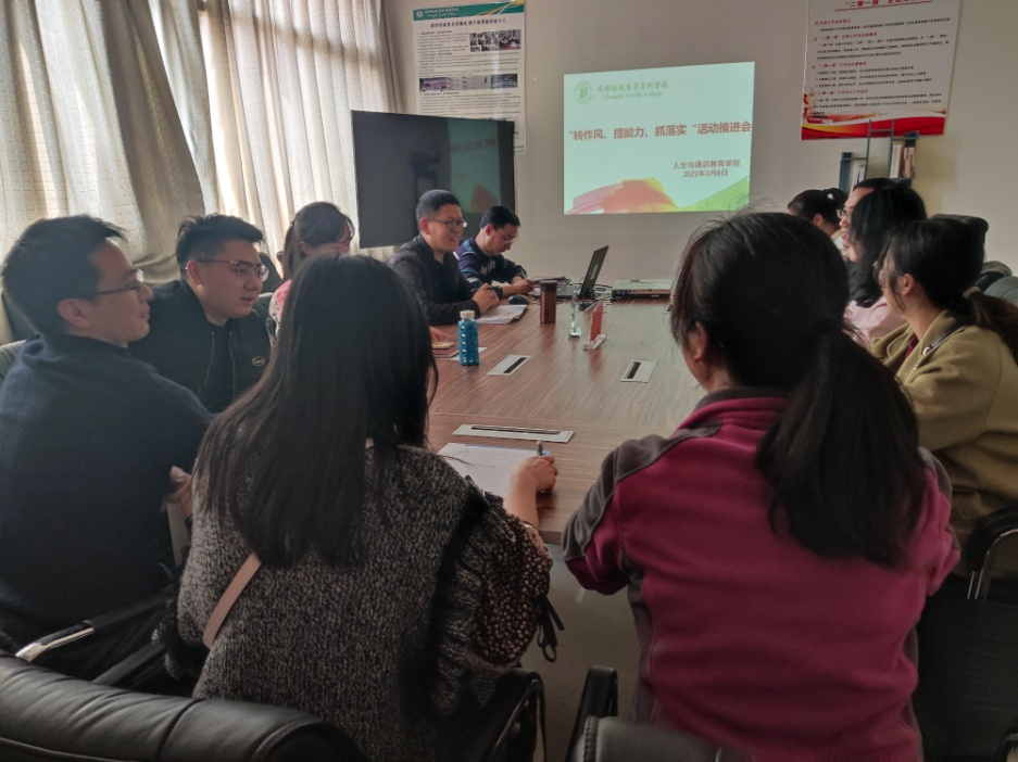 3月8日下午,人文与通识教育学院在D508召开“转作风、提能力、抓落实”活动推进会。学院直属党支部书记李光胜、院长陈骑兵和全体教职工参加会议,会议由陈骑兵院长主持。