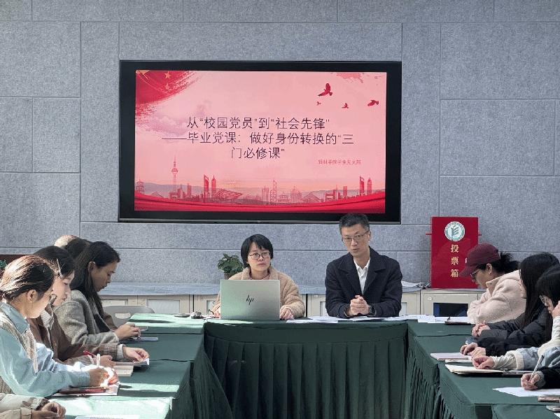 11月19日,轻工与材料学院党总支书记蒋旎以《做好身份转换的“三门必修课”》为题,为学院学生党支部全体党员讲授专题党课,引导学生党员突破认知局限,将党性修养融入实践行动,为顺利步入职场、实现高质量发展筑牢根基。