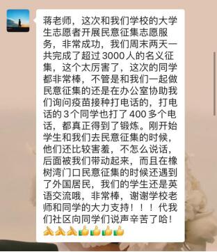 同时,志愿者们也收获满满,从开始的羞涩无措到随后的落落大方,从开始的手忙脚乱到随后的井然有序。钱雪丹同学表示:本次志愿服务得到社区和居民赞赏的同时,充实了自己的课余生活,自己的综合能力也得到了锻炼和提升,今后会更加积极地投身志愿工作,身体力行践行暖心服务。