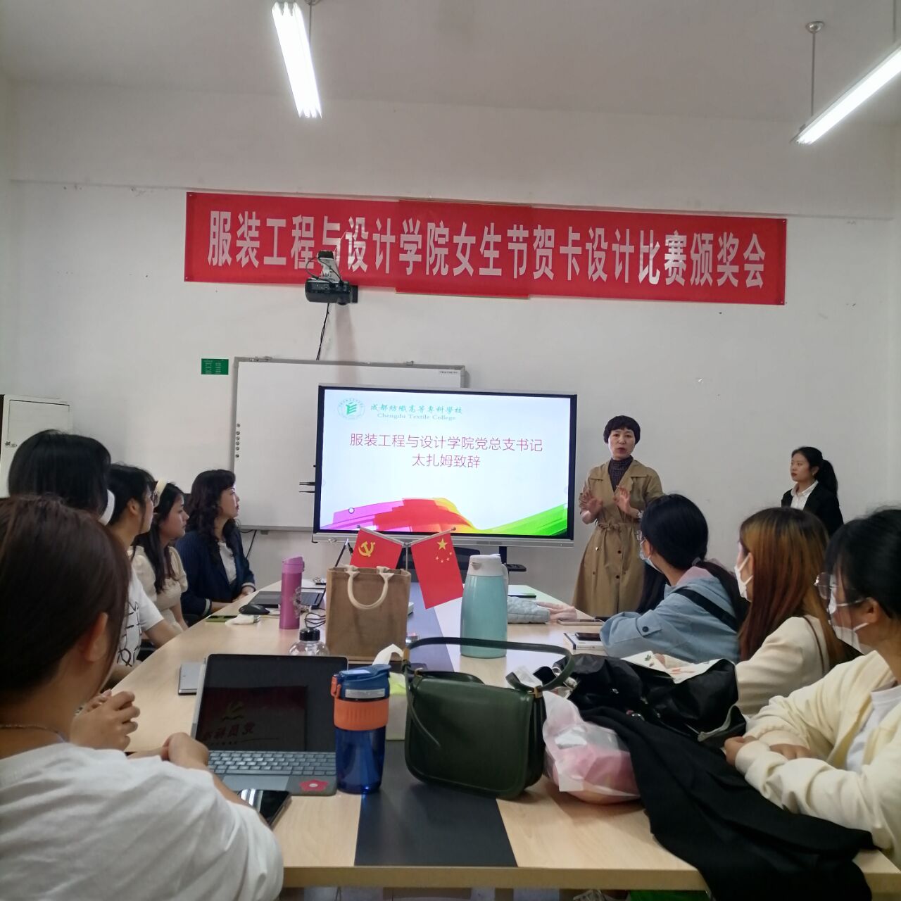 3月14日中午,服装工程与设计学院在E211会议室举行女生节贺卡设计比赛颁奖会。1日至13日,学院开展的“暖心一艺”心理活动——女生节贺卡设计比赛和作品展,将专业学习与课外生活相结合、心理教育和美育相融合,育心于美,促进了校园文化建设。党总支书记太扎姆、副书记赵爽为优胜者颁奖;获奖同学向大家分享了作品的设计理念。