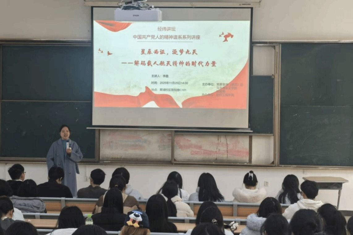 为深入学习中国共产党人的精神谱系,传承和弘扬载人航天精神,引导青年学子汲取奋进力量,11月25日,由党委宣传(统战)部、马克思主义学院和校团委联合主办,纺织工程学院协办的“经纬讲坛—中国共产党人的精神谱系系列讲座”第七期专题讲座在pg电子致知楼C101举行。马克思主义学院李鑫老师以“星辰为证,逐梦九天——解码载人航天精神的时代力量”为主题进行讲授。纺织工程学院近200名同学到场聆听讲座。