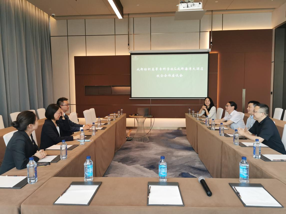 3月17日,外语与文化旅游学院党总支书记樊廷友、副院长梁金柱、旅游教研室主任杨婷婷、日语旅游教研室主任刘洋和英语专业教研室主任胡贞贞一行5人前往成都海湾大酒店调研交流,与公司总经理郭有为、行政总监罗家红、人力资源部经理游力就校企合作进行深度洽谈。