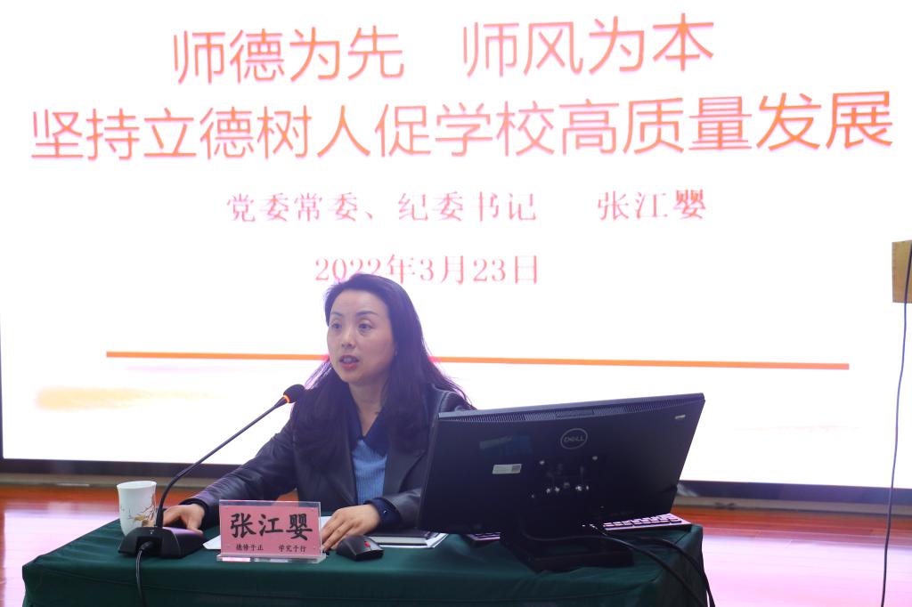 3月23日,学校2022年青年教师“转作风、提能力、抓落实”专题培训班开班仪式在综合楼三楼会议室举行,党委常委、纪委书记张江婴出席并作师德师风专题讲座。