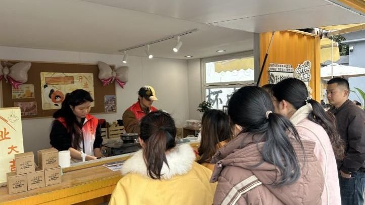 在志愿者同学们的指导下,社区老人、儿童和家长亲手制作出独具韵味的漆扇作品。同时,由学生团队自主运营的“创意咖啡站”也吸引了众多目光,生椰拿铁、乌龙茶咖等特色饮品展示了同学们的创新思维,更是一次贴近市场的微型创业实践。