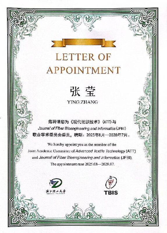 2025年6月,《现代纺织技术》(ATT)与英国纺织领域重要学术期刊《Journal of Fiber Bioengineering and Informatics》(JFBI)联合组建ATT&JFBI中英双刊联合编委会工作正式启动。经个人申请、编辑部初审、会议遴选及编委会审议等严格流程,该联合组织于近期公布了ATT&JFBI中英双刊首届联合编委会成员,pg电子轻工与材料学院教师张莹博士受聘为青年编委,是青年编委成员中唯一的职业院校教师。