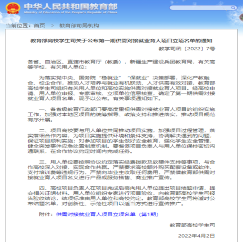 据悉,供需对接就业育人项目是教育部高校学生司为落实党中央、国务院“稳就业”“保就业”决策部署而开展的,以深化产教融合、校企合作,推动人才培养与就业有机联动、人才供需有效对接为目的的就业育人项目。