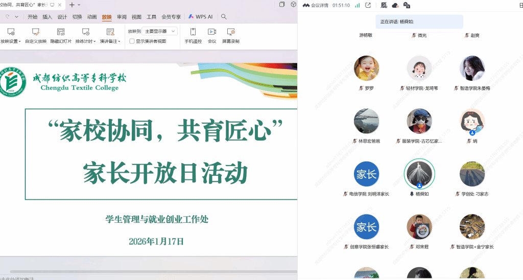 1月17日上午,学校通过线上会议举行“家校协同·共育匠心——助力毕业班学生扬帆起航”2025年度家长开放日活动,加强家校沟通,凝聚育人合力。学创处科级以上干部、教务处相关老师,各学院党总支副书记、毕业班辅导员及毕业班家长代表300余人云端相聚,共话学生成长与发展。