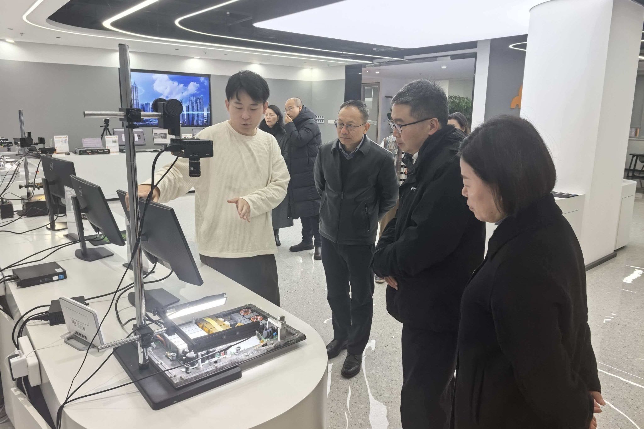 调研期间,在阿加犀产教融合负责人张馨文陪同下,任迎伟一行参观公司展厅,近距离了解了阿加犀在端侧人工智能、智能机器人研发、工业质检AI解决方案等核心业务领域的技术优势与应用成果。企业工程师重点演示自主研发的AidLux AIoT应用开发平台、“犀牛派X1”开发板及具身智能机器人“通天晓”等核心产品,详细介绍了其在跨生态融合架构、端侧AI高效部署等领域的创新突破,以及在工业智能制造等场景的实践案例。