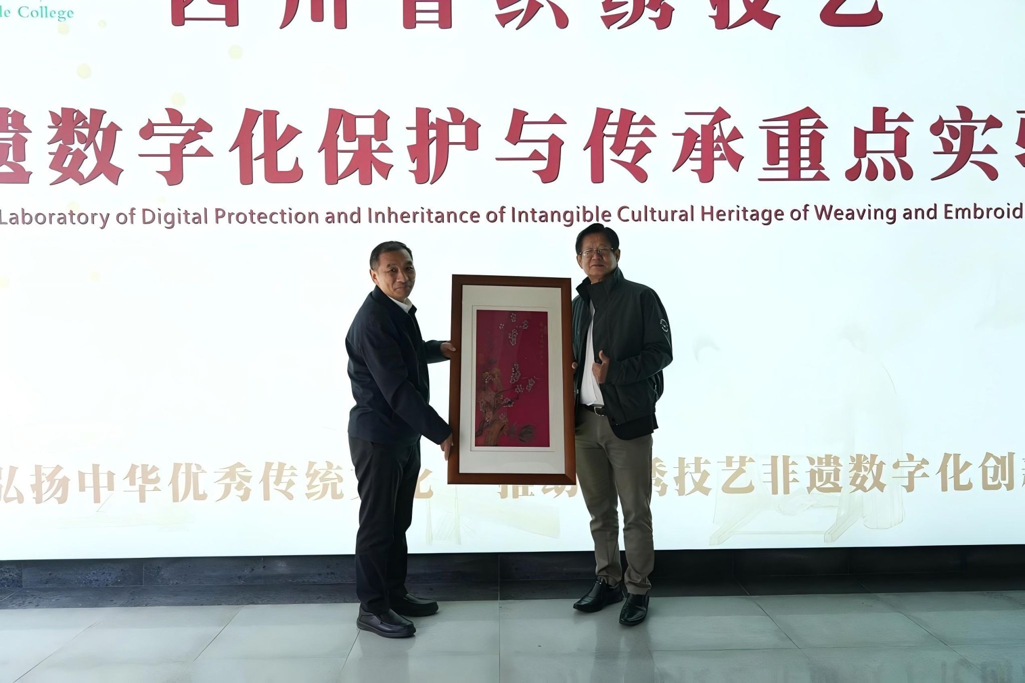 会后,代表团一行参观pg电子四川省织绣技艺非遗数字化保护与传承重点实验室,实地感受了pg电子在非遗数字化保护、织绣技艺传承与现代职业教育融合发展的成果。孙锐代表学校向来访嘉宾赠送蜀锦《梅开五福竹报平安》,以非遗文化为纽带,增进两校友谊。