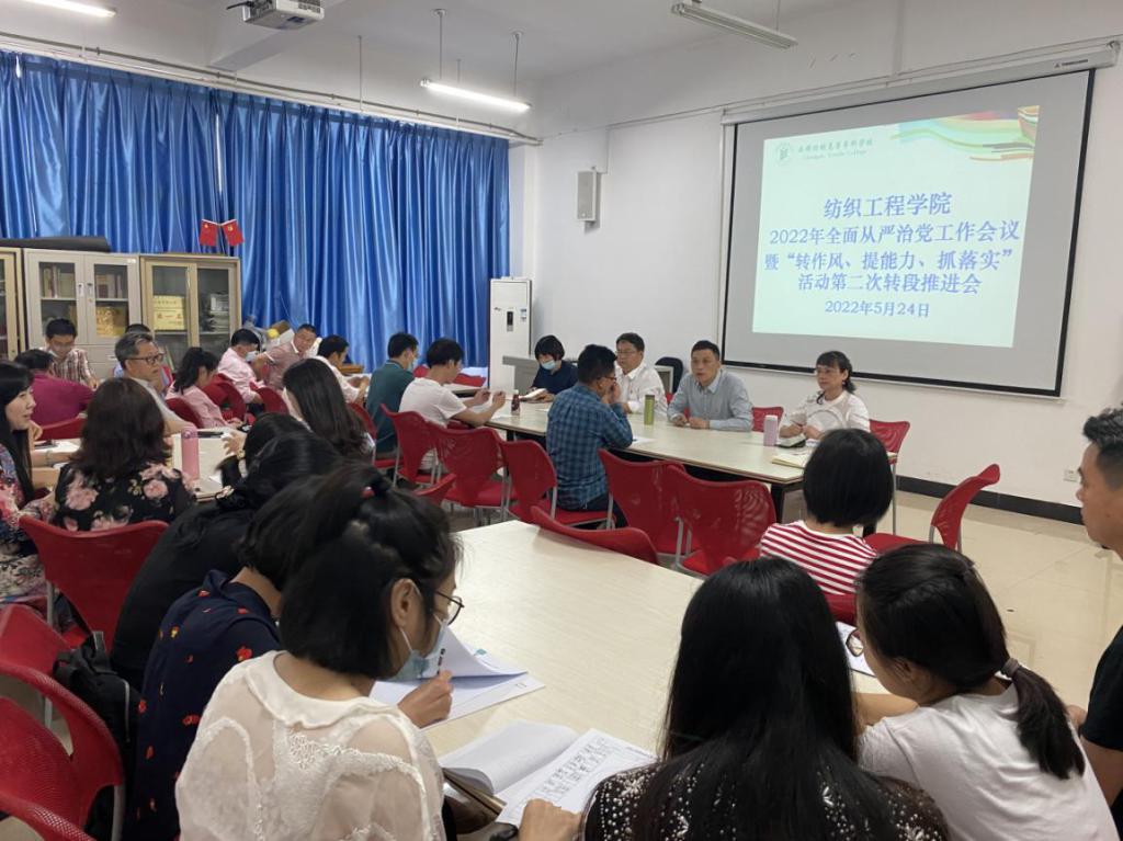 5月24日下午,纺织工程学院组织全体教职工在实训楼D204召开2022年全面从严治党工作会议暨“转作风、提能力、抓落实”活动第二次转段推进会,学院党政领导参加会议,会议由党总支书记徐翔主持。