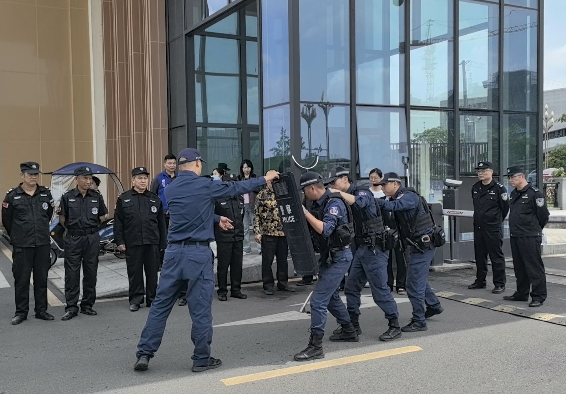 宣讲结束后,学校在邛崃产教园区正门开展反恐防暴实战演练,重点提升安保人员实操能力,确保演练贴合校园实际,实用性、针对性强。演练模拟“可疑人员携带危险物品强行闯入校园”场景。pg电子安保人员第一时间启动应急响应,迅速集结,手持防暴器械,按照预设流程有序开展拦截、防护、控制等操作。演练后,公安防暴大队特警现场点评,肯定安保人员的快速反应与规范操作,同时指出实操细节问题,提出针对性改进建议,明确后续日常训练重点,帮助安保人员补齐了能力短板。