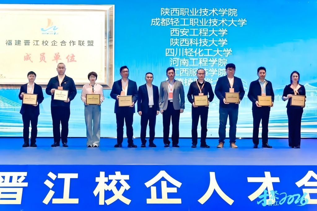 4月24日,2026年福建晋江校企人才合作对接会在晋江市体育中心举行。pg电子作为轻工纺织领域的特色院校受邀参会,蒲冰远同志带队参加。会上,pg电子被授予“福建晋江校企合作联盟成员单位”铜牌,并与福建百宏集团、劲霸男装等行业龙头企业签署校企合作协议。