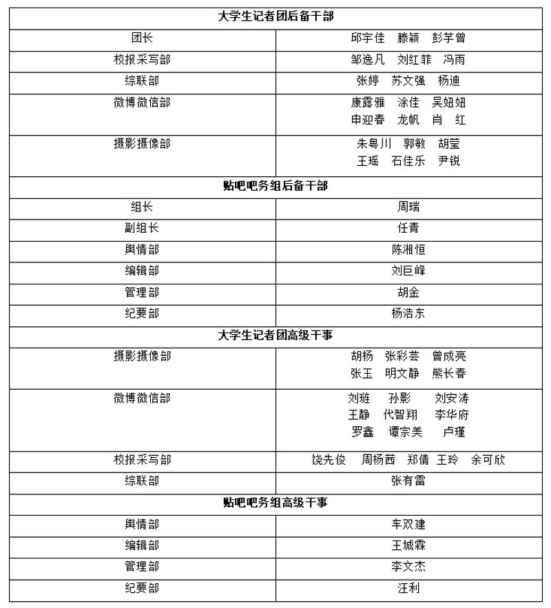 新一届大学生记者团、贴吧吧务组全体干部及干事名单: