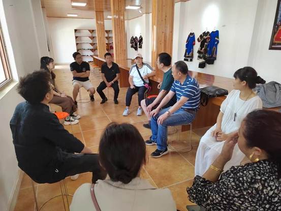 考察后,在县妇女创业服务中心的彝绣工坊,老师们与县妇联、县驻社区干部、社区负责人和学院合作单位雷波赶街电子商务有限公司总经理吴威等就彝绣与彝族服饰的纹样图案创新设计、彝绣文创产品开发、技能培训、设计制作营销体系建立等进行深度交流。苦依地主席代表当地衷心感谢学校对彝族山区发展的关心,恳请学校和老师们在乡村振兴承上启下的关键之年,为金阳彝绣产品创品牌、找销路,一如既往地支持与帮扶社区广大彝族妇女可持续的居家就业、增收致富。老师们就彝族传统文化中重要元素的设计理解与表现,与大家详细沟通交流,并表示:帮助彝族地区振兴是学校和学院义不容辞的责任,学院将充分利用专业优势,不遗余力地为金阳的彝族刺绣创作出融入现代生活的设计图案,研究开发多类多款不受地域限制的文创产品,切实为彝族地区乡村振兴事业贡献成纺力量。