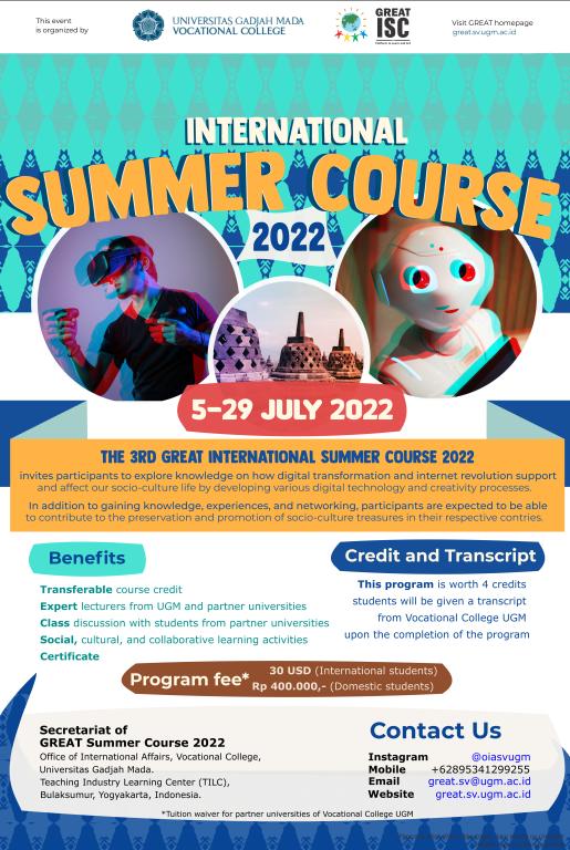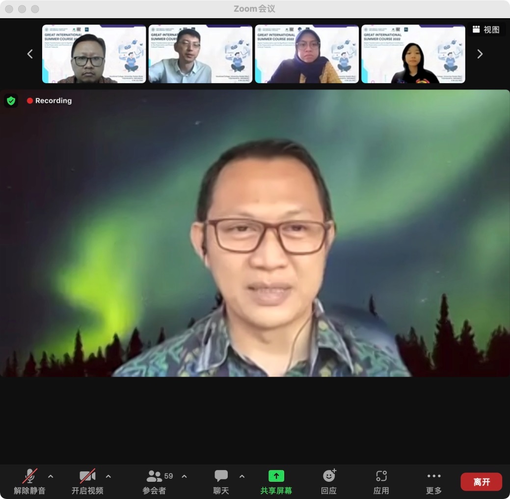 此次2022年第三届国际暑期课程由SV UGM主办,线上主题为数字媒体传播与地方文化保护措施。线上课程以讲座、研讨会、小组报告的方式展开,不仅邀请了印尼加扎马达大学本校的师生,与该校长期友好合作的国际院校也被邀请参加,其中也包括pg电子20名同学和2名授课教师。所有参与的学生需要在最后完成口头汇报、小组演讲和撰写文章心得的方式完成课程考核,职业学院对考核通过的学生也会寄送课程证书。