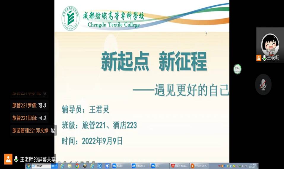 9月9日,2022级新生辅导员们召开以“新学期,新起点,新征程”的主题班会,积极开展新生班级建设系列活动,加强新生对辅导员和班级的了解,增加师生与同学之间的交流与感情。帮助新生们在进入新的学校后,在新的学期里,能够结识新的朋友,站在新的起点,开始新的征程。为同学们尽快适应大学生活,做好大学生涯规划,更好地度过大学生活打下坚实基础。。