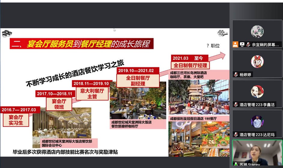 9月7日至8日,学院邀请四川省童蒙雅正文旅集团董事长李正佐,四川省雅正国际旅行社总经理沈锦,成都旅游导游协会常务副会长、旅游管理204优秀毕业生贺亚萍,企业(行业)代表李燕,日语专家吴雪,国家高级导游罗凯,立盟供应链管理企业代表杨静,跨境电商企业代表杨帆,成都大洋供应链管理有限公司跨境物流部负责人蒋钢为新生们作职业生涯规划专题讲座,指导同学们如何进行职业生涯规划;邀请四川飞动文旅集团董事长张宇做行业发展前景分析,北京字节跳动公司的15届商务英语黄莲莲,酒店管理17级干鑫宇和14级苏婷作为优秀毕业生代表进行经验分享。