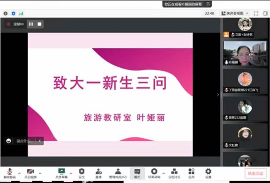 旅游教研室叶娅丽教授作“致大一新生三问”专题讲座,提出“为谁学、学什么、怎么学”,引导同学们深入思考,明确学习目标。研学旅行管理与服务专业21级优秀在校生涂雅雯应邀作学习分享。