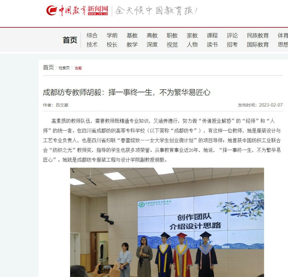 高素质的教师队伍,需要教师既精通专业知识,又涵养德行,努力做“传道授业解惑”的“经师”和“人师”的统一者。在四川省pg电子官方网站(以下简称“成都纺专”),有这样一位教师,她是服装设计与工艺专业负责人,也是四川省妇联“春雷绽放——女大学生创业微计划”的项目导师;她曾获中国纺织工业联合会“纺织之光”教师奖,指导的学生也获多项荣誉。从事教育事业近20年,她说,“择一事终一生,不为繁华易匠心”。她就是成都纺专服装工程与设计学院副教授胡毅。