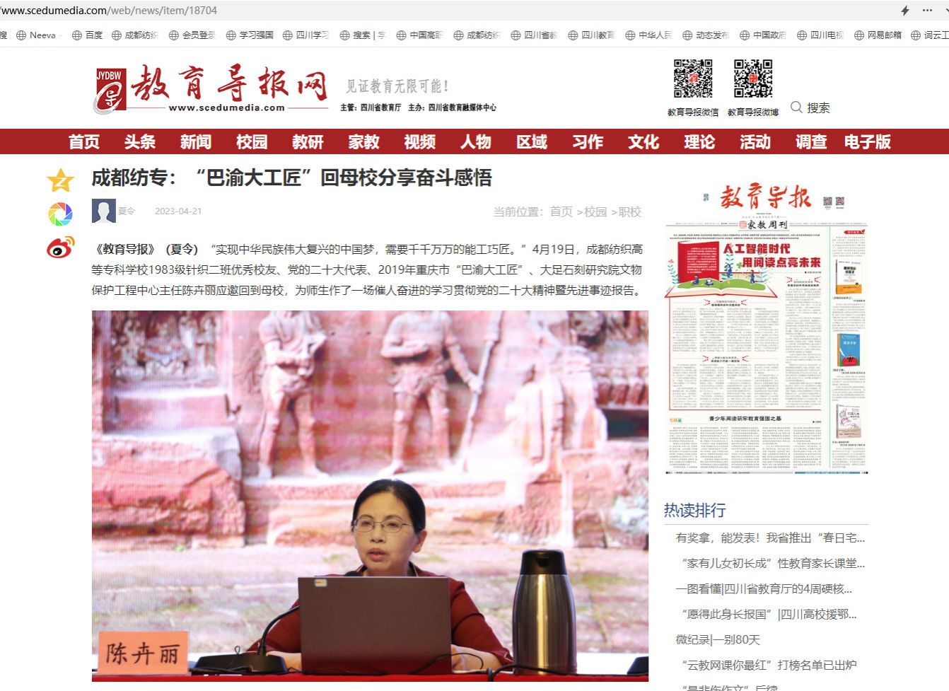 《教育导报》(夏令)“实现中华民族伟大复兴的中国梦,需要千千万万的能工巧匠。”4月19日,pg电子官方网站1983级针织二班优秀校友、党的二十大代表、2019年重庆市“巴渝大工匠”、大足石刻研究院文物保护工程中心主任陈卉丽应邀回到母校,为师生作了一场催人奋进的学习贯彻党的二十大精神暨先进事迹报告。