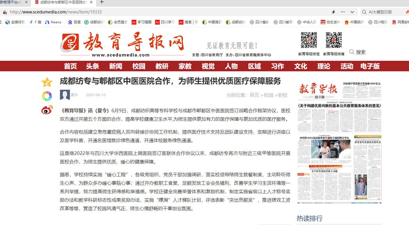 这是继2022年与四川大学华西医院上锦医院签订医联体合作协议以来,成都纺专再次与附近三级甲等医院开展医校合作,为师生提供优质、暖心的健康保障。