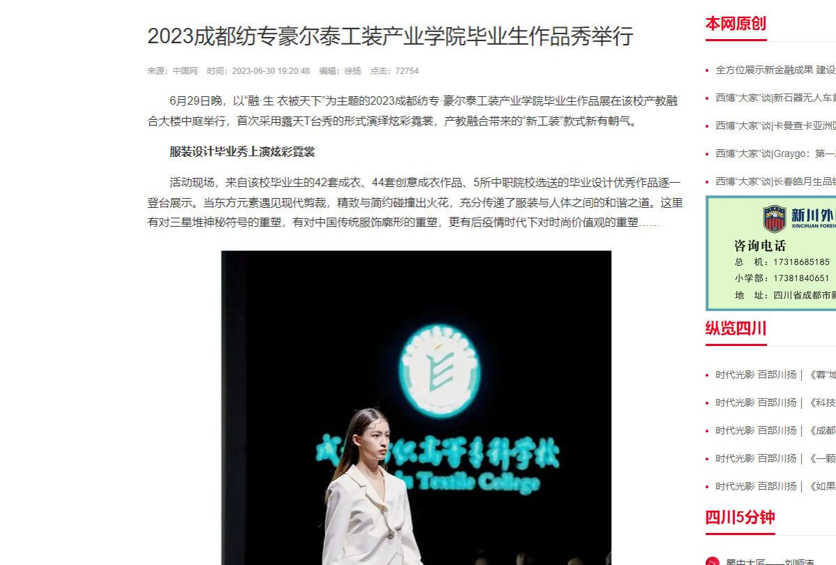 6月29日晚,以“融·生 衣被天下”为主题的2023成都纺专·豪尔泰工装产业学院毕业生作品展在该校产教融合大楼中庭举行,首次采用露天T台秀的形式演绎炫彩霓裳,产教融合带来的“新工装”款式新有朝气。