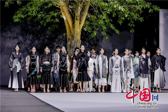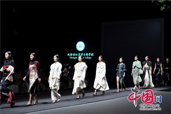 活动现场,来自该校毕业生的42套成衣、44套创意成衣作品、5所中职院校选送的毕业设计优秀作品逐一登台展示。当东方元素遇见现代剪裁,精致与简约碰撞出火花,充分传递了服装与人体之间的和谐之道。这里有对三星堆神秘符号的重塑,有对中国传统服饰廓形的重塑,更有后疫情时代下对时尚价值观的重塑……