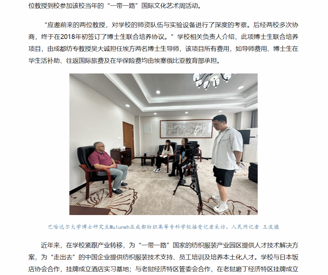 “应邀前来的两位教授,对学校的师资队伍与实验设备进行了深度的考察。后经两校多次协商,终于在2018年初签订了博士生联合培养协议。”学校相关负责人介绍,此项博士生联合培养项目,由成都纺专教授吴大诚担任埃方两名博士生导师,该项目所有费用,如导师费用、博士生在华生活补助、往返国际旅费及在华保险费均由埃塞俄比亚教育部承担。