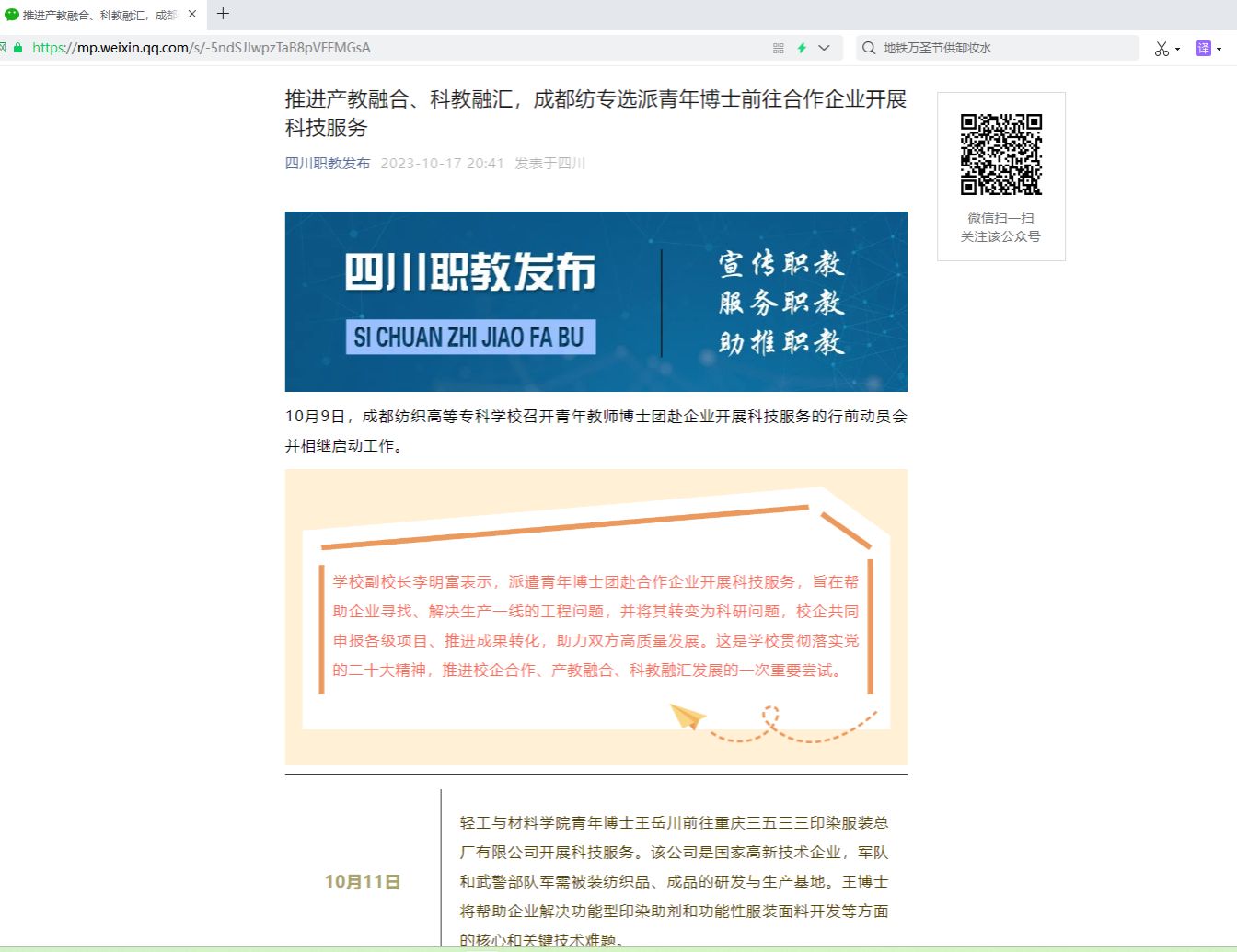 电信学院周文炯、智造学院杨武成、纺织学院张洵3位青年博士教师组队奔赴合作企业成都海蓉特种纺织品有限公司,围绕特种纺织品智能化生产等企业核心和关键技术难题进行为期半年的技术服务。