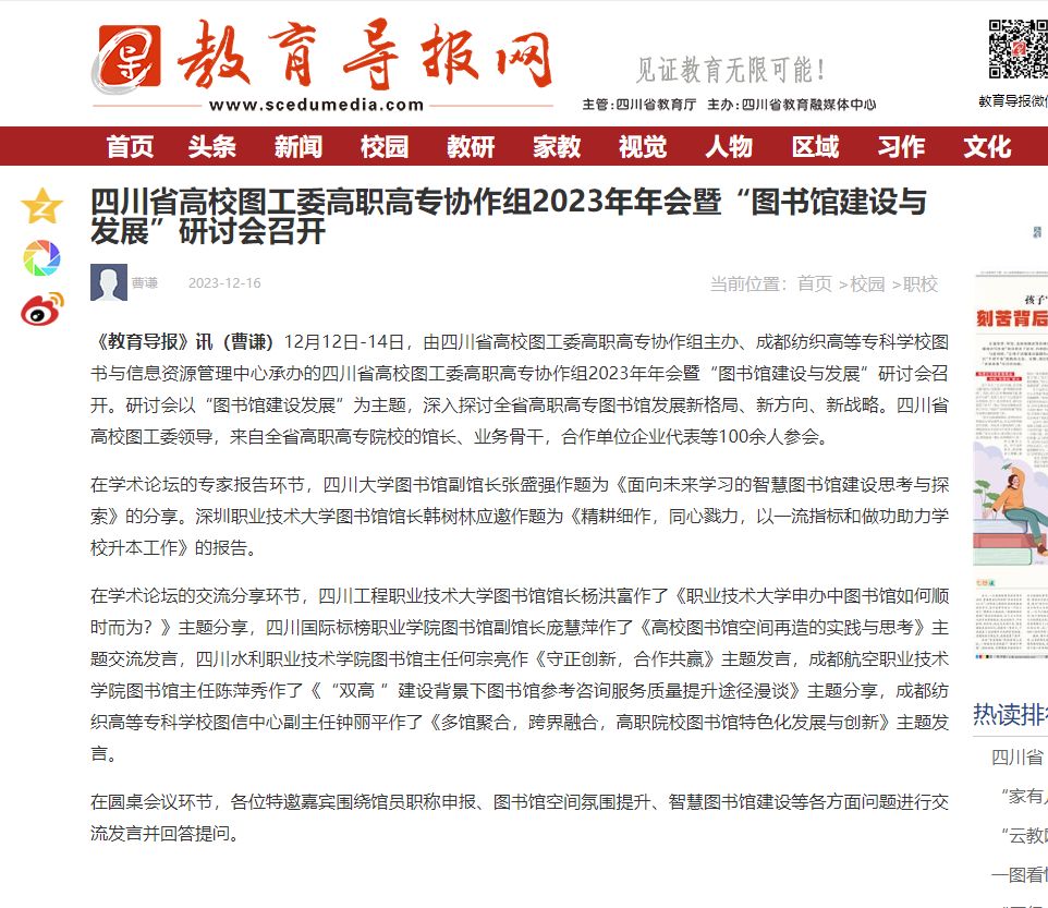 《教育导报》讯(曹谦)12月12日-14日,由四川省高校图工委高职高专协作组主办、pg电子官方网站图书与信息资源管理中心承办的四川省高校图工委高职高专协作组2023年年会暨“图书馆建设与发展”研讨会召开。研讨会以“图书馆建设发展”为主题,深入探讨全省高职高专图书馆发展新格局、新方向、新战略。四川省高校图工委领导,来自全省高职高专院校的馆长、业务骨干,合作单位企业代表等100余人参会。