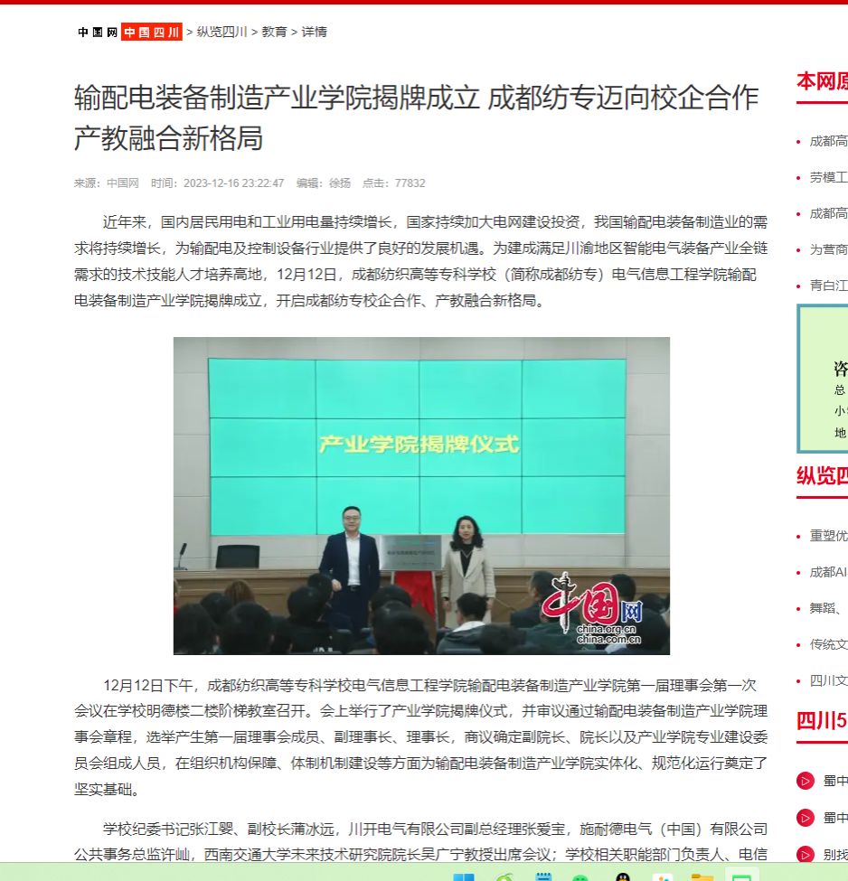 近年来,国内居民用电和工业用电量持续增长,国家持续加大电网建设投资,我国输配电装备制造业的需求将持续增长,为输配电及控制设备行业提供了良好的发展机遇。为建成满足川渝地区智能电气装备产业全链需求的技术技能人才培养高地,12月12日,pg电子官方网站(简称成都纺专)电气信息工程学院输配电装备制造产业学院揭牌成立,开启成都纺专校企合作、产教融合新格局。