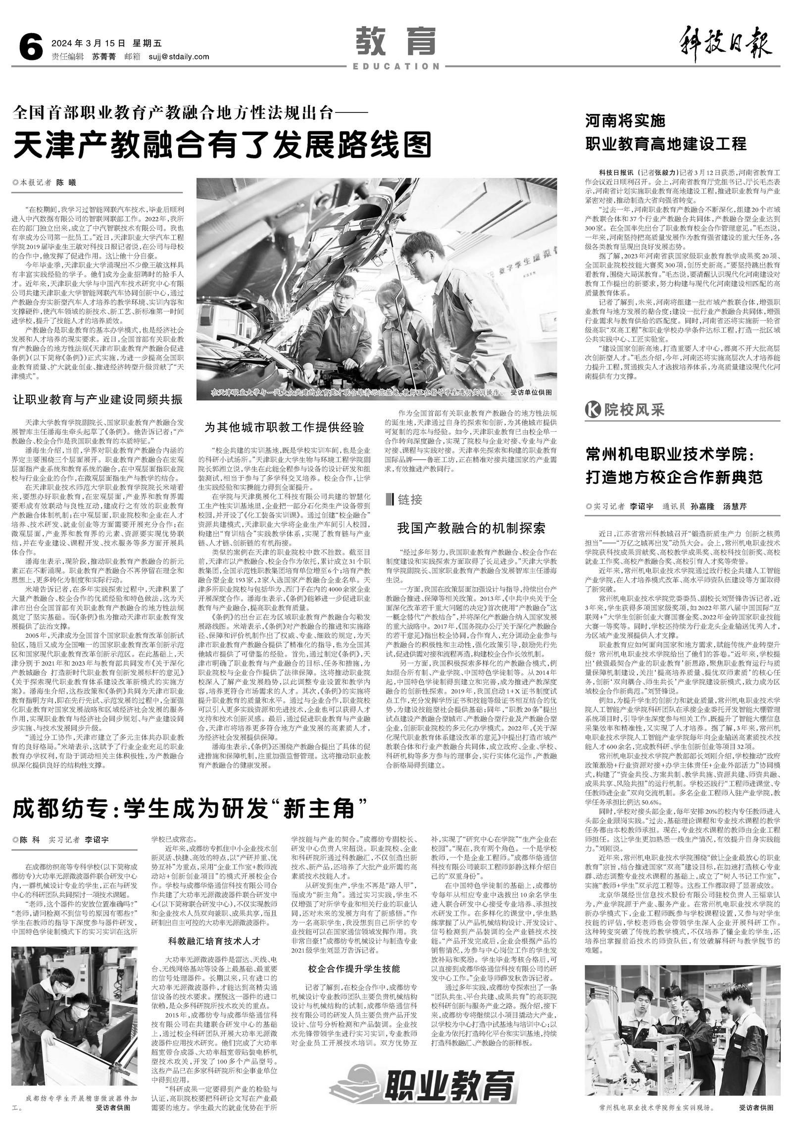 “科研成果一定要得到产业的检验与认证,高职院校要把科研论文写在产业最需要的地方。学生最大的就业优势在于所学技能与产业的契合。”成都纺专副校长、研发中心负责人宋超说。职业院校、企业和科研院所通过科教融汇,不仅创造出新技术、新产品,还培养了大批产业所需的高素质技术技能人才。