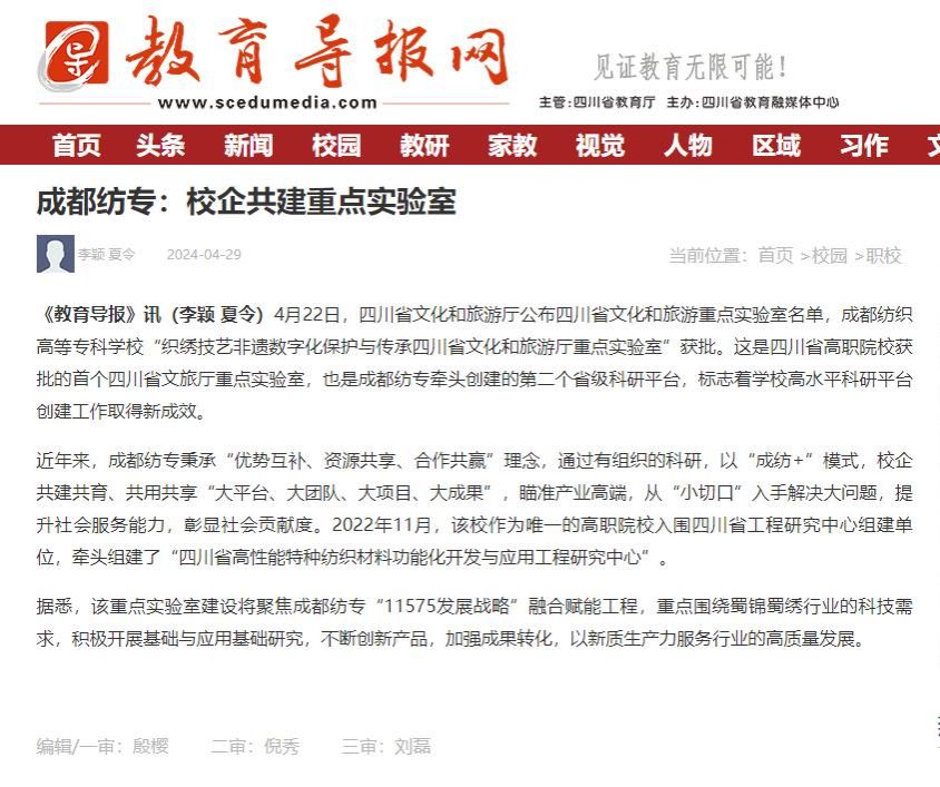 《教育导报》讯(李颖 夏令)4月22日,四川省文化和旅游厅公布四川省文化和旅游重点实验室名单,pg电子官方网站“织绣技艺非遗数字化保护与传承四川省文化和旅游厅重点实验室”获批。这是四川省高职院校获批的首个四川省文旅厅重点实验室,也是成都纺专牵头创建的第二个省级科研平台,标志着学校高水平科研平台创建工作取得新成效。