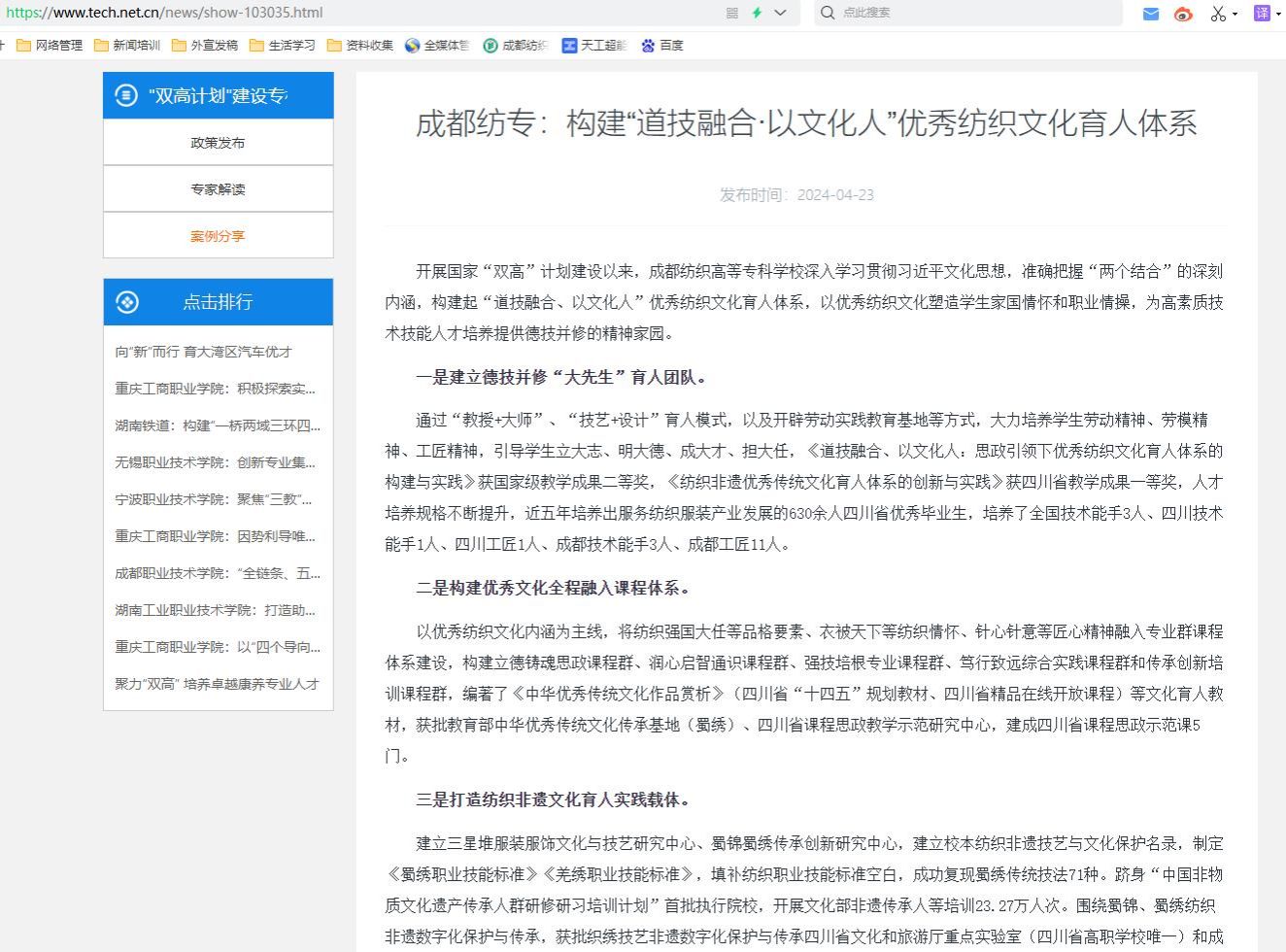 以优秀纺织文化内涵为主线,将纺织强国大任等品格要素、衣被天下等纺织情怀、针心针意等匠心精神融入专业群课程体系建设,构建立德铸魂思政课程群、润心启智通识课程群、强技培根专业课程群、笃行致远综合实践课程群和传承创新培训课程群,编著了《中华优秀传统文化作品赏析》(四川省“十四五”规划教材、四川省精品在线开放课程)等文化育人教材,获批教育部中华优秀传统文化传承基地(蜀绣)、四川省课程思政教学示范研究中心,建成四川省课程思政示范课5门。